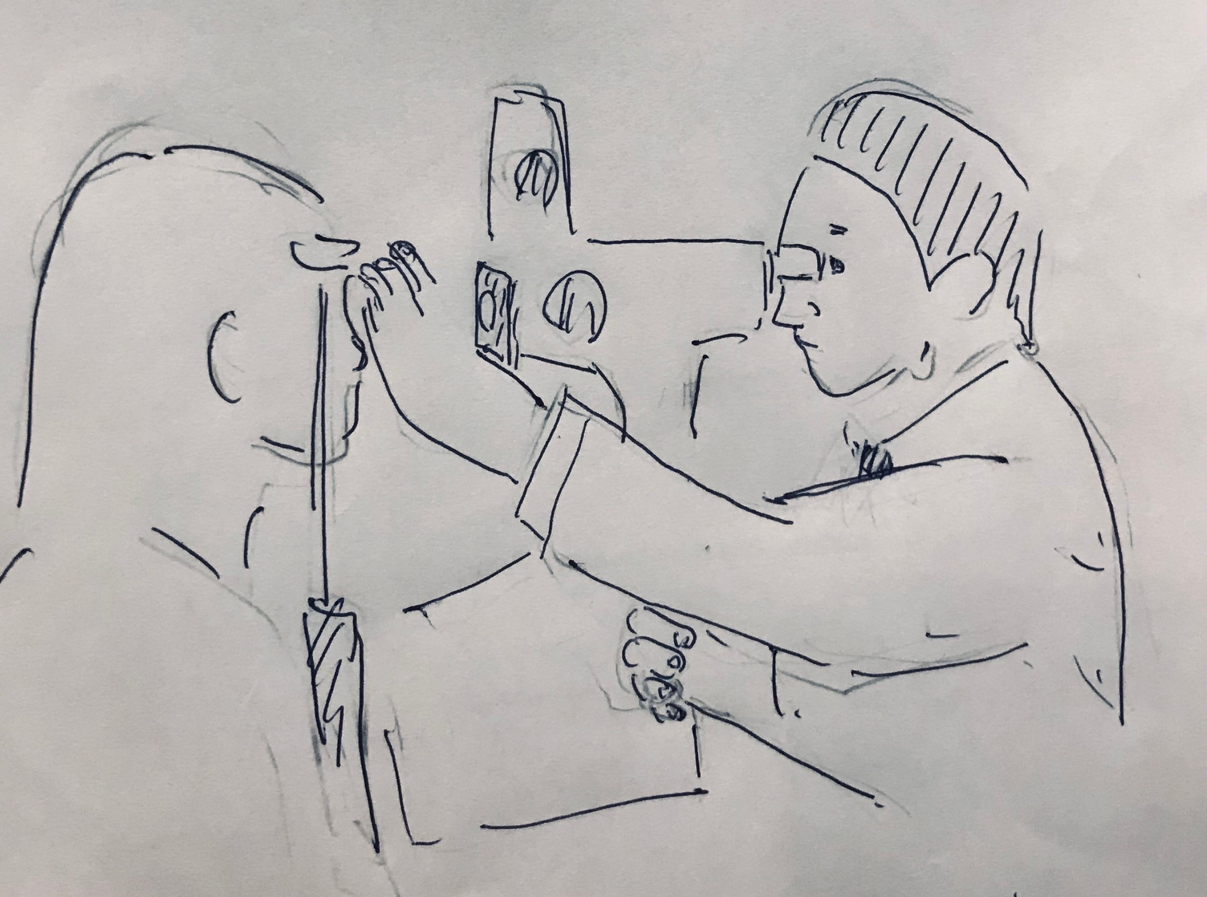 眼科医との事で、眼の検査でレンズをのぞき込むことが多く、頭を前に出している姿勢が首のこわばりの主な原因と考えられる。後頭下筋(うなじ)斜角筋・胸鎖乳突筋(首前)肩甲挙筋(首横)の緊張が強い。後頭下筋の緊張は頭痛を併発しやすい。首横・前の筋肉の緊張があると、首を横と後ろに倒しづらくなる。これが仰向けに寝た時の首の違和感になっていると考えられる。
