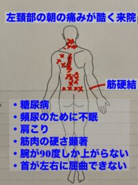 来院時に首を左右に動かすことができず、腕も90度ほどしか上がらない。起床時の首の痛みが酷い。頻尿で眠れないのでなんとかならないかとご来院なさいました。