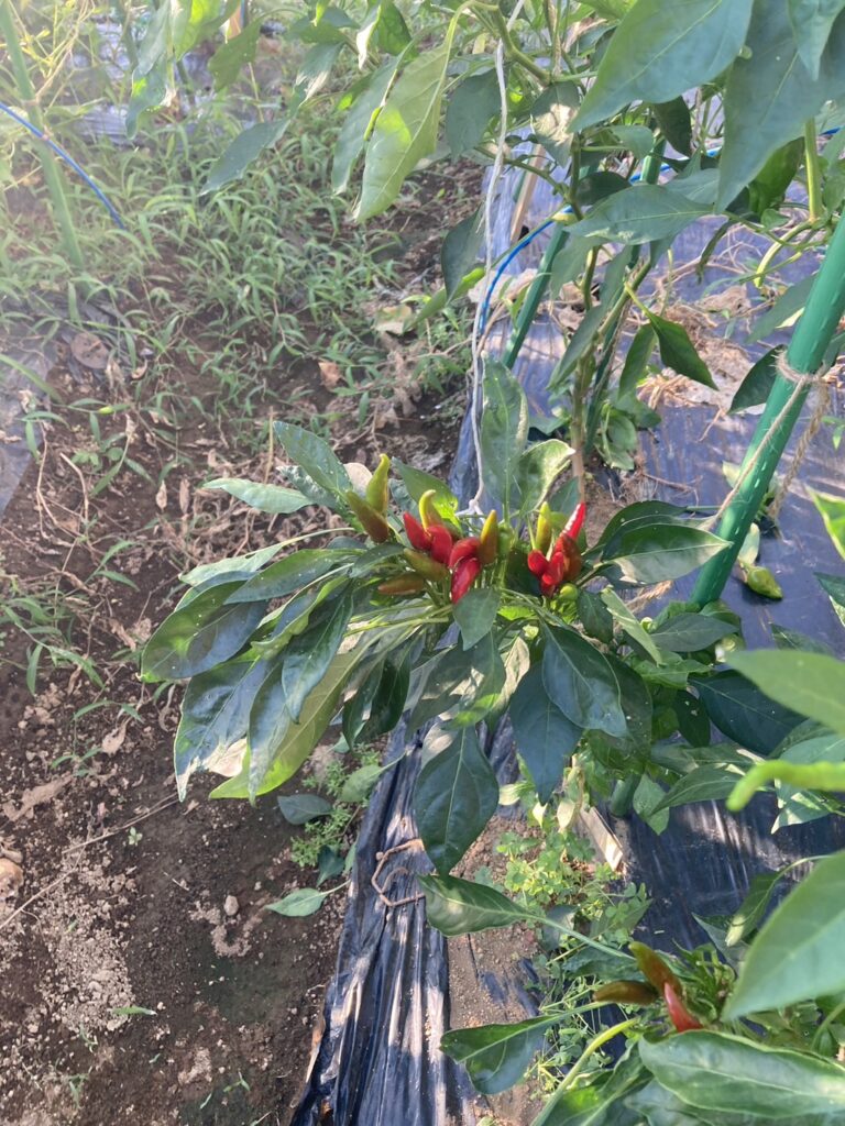 野菜を育てるのも奥が深く、その年の天気や気温などに合わせて色んな工夫が必要となります。今年(2024年)は大変暑くて農作業は汗だくでした。写真は唐辛子です。干して鷹の爪にします。